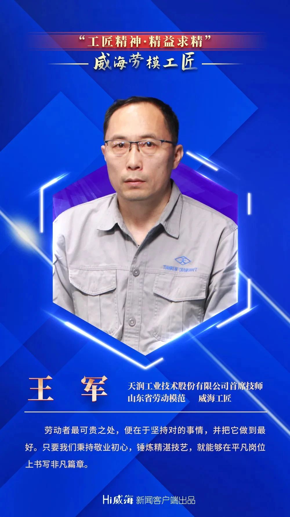近日,威海市政府新闻办举行“大抓经济 大抓基层 大抓落实”典型代表记者见面会,天润工业首席技师、山东省劳动模范、威海工匠王军被选为劳模工匠代表分享了自己的奋斗故事。