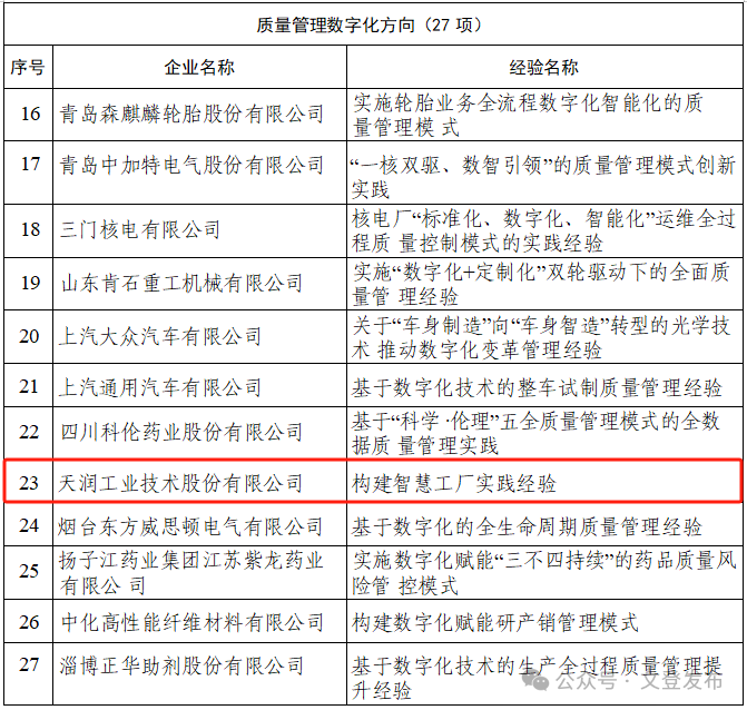 近日,中国质量协会公布《2024年质量标杆典型经验名单》,天润工业“构建智慧工厂实践经验”成功入选国家级--质量管理数字化典型经验领域名单,且为本年度威海市唯一入选单位。