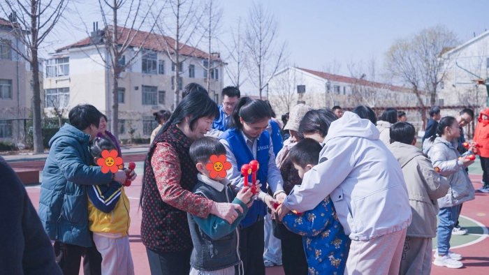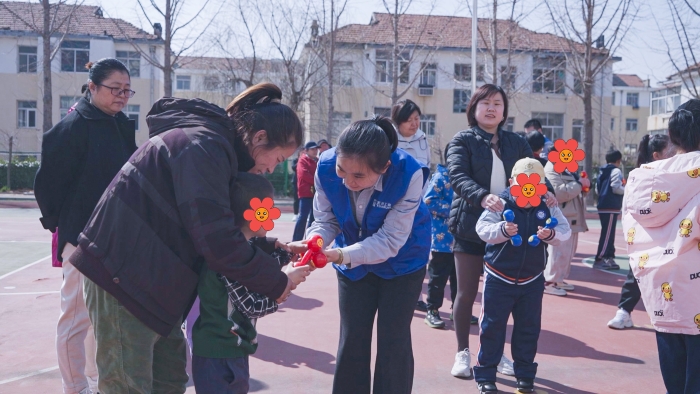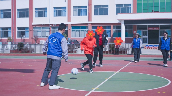 活动之前,党委办公室特地与学校方面进行细致沟通,了解学校需求,已达到定向慰问之目的。上午10时,满载着教学用具、益智玩具、食品礼包以及手拍鼓等小乐器的爱心队伍抵达学校。在操场上,志愿者们利用购买的益智玩具参与到孩子们的课间操环节,所有孩子都领取了一副手摇铃,大家一起跟随教师们的节奏摇晃着手铃,做起了课间体操。随后,志愿者们还携手残障儿童开展了趣味足球赛,志愿者配合着孩子们传球互动,欢呼声此起彼伏。