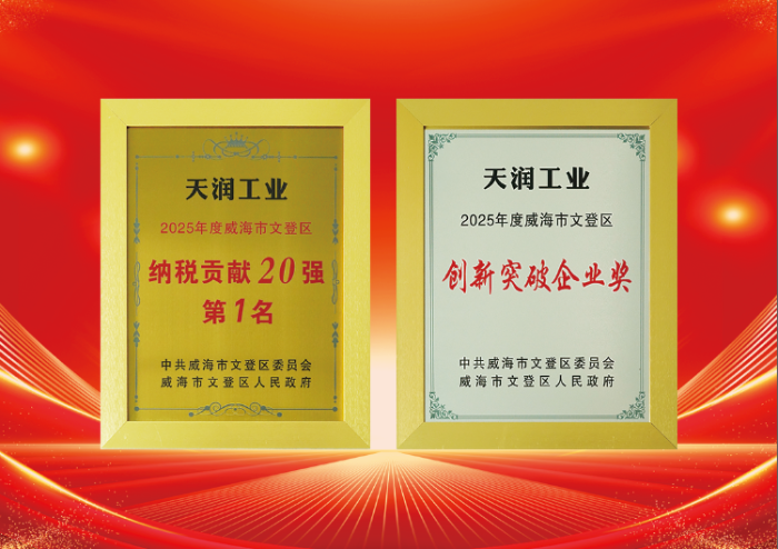 2月25日,在文登区2026年工作动员大会上,天润工业再获殊荣,成功荣获文登区2025年度“纳税贡献20强第1名”和“创新突破企业奖”。